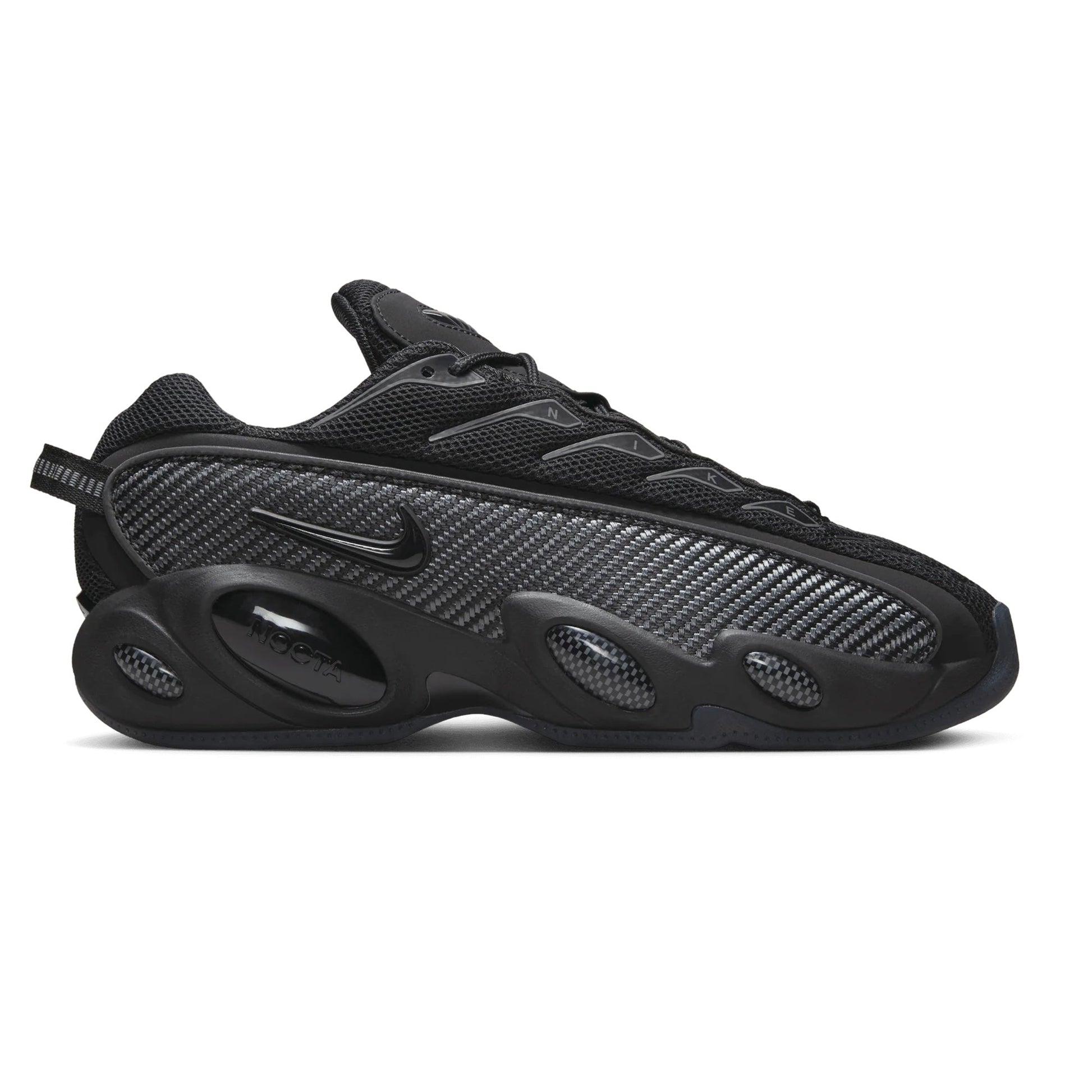 La tomaia in mesh tecnico nero con sovrapposizioni in Iron Grey offre traspirabilità e struttura, mentre gli elementi laterali in fibra di carbonio donano un tocco high-tech e un look aggressivo. L’intersuola voluminosa con unità Air visibile garantisce ammortizzazione e comfort di alto livello, mentre la suola in gomma traslucida assicura trazione e stabilità. I loghi NOCTA su linguetta, tallone e soletta interna aggiungono esclusività e raffinatezza a un modello che ridefinisce lo streetwear premium.